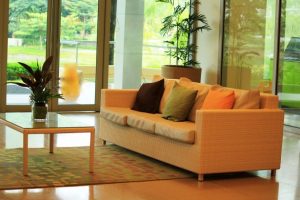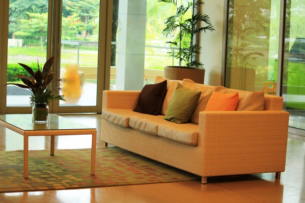 Black table next to sofa with green blanket in cozy apartment interior with gallery of posters